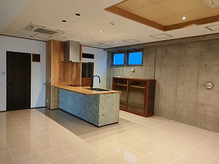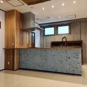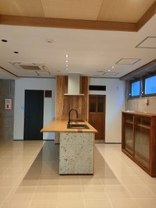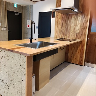 オープンキッチンが展示されておりますが、こちらはすべてオリジナルです。材木屋様の展示室ですので「木」を要所要所に使っております。