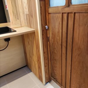 年期の入ったステキな一点ものです。これらをぜひ取り入れたいとのことでしたので、パントリーへ入る扉と、キッチン背面に設置した食器棚として取り入れました。